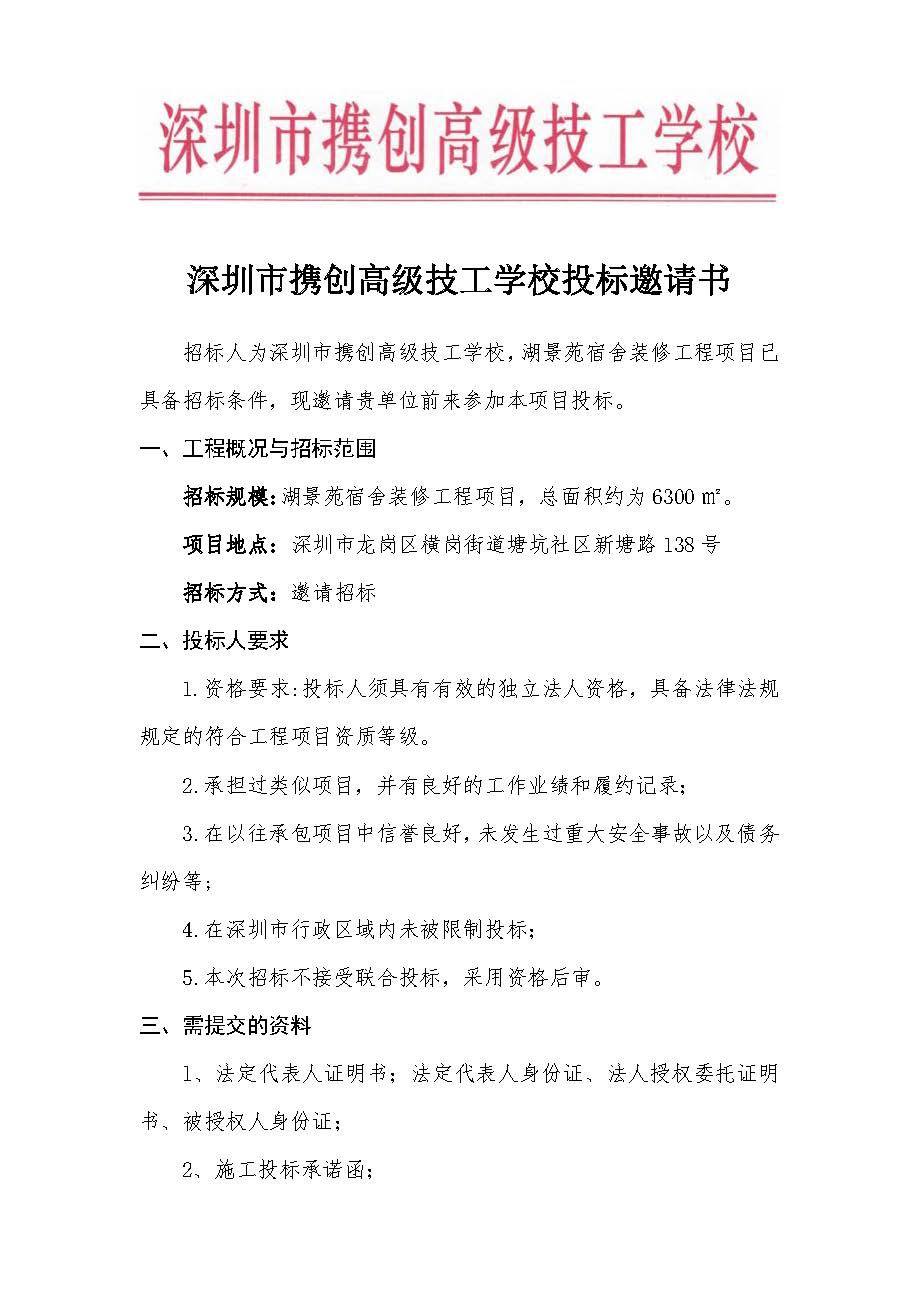 关于携创高级技工学校湖景苑宿舍装修工程项目的投标邀请书
