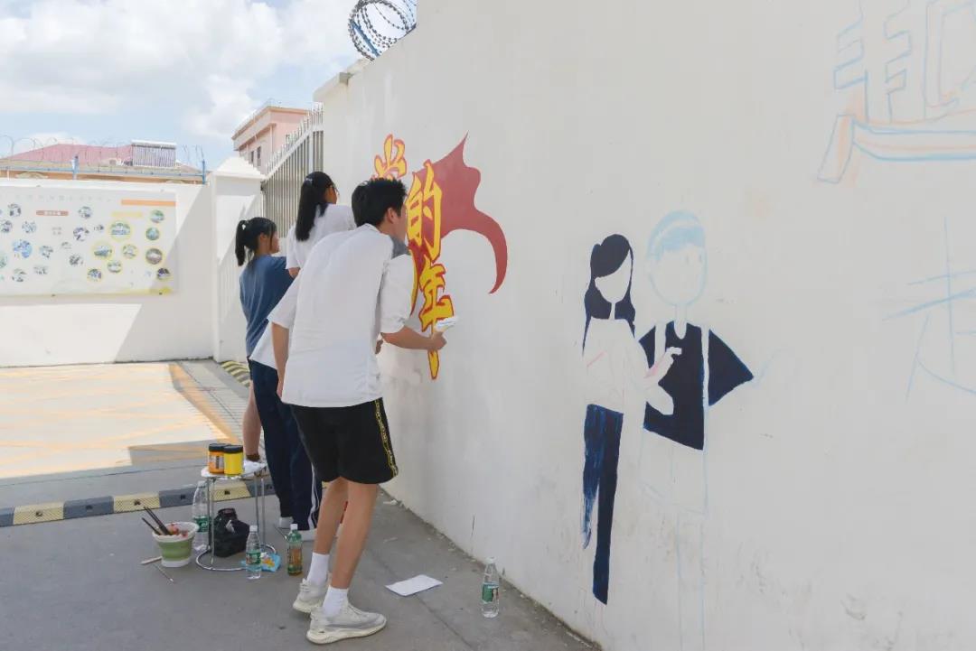 "奋斗吧少年"、"劳动最光荣"、"年轻不服输"……7月13日上午10点,50余名来自深圳市携创高级技工学校20级计算机动画与制作专业的学子正齐聚在六约社区茶山路与学校外围交汇的围墙处,手工绘制着一道五彩斑斓、内容丰富的"文化墙"。