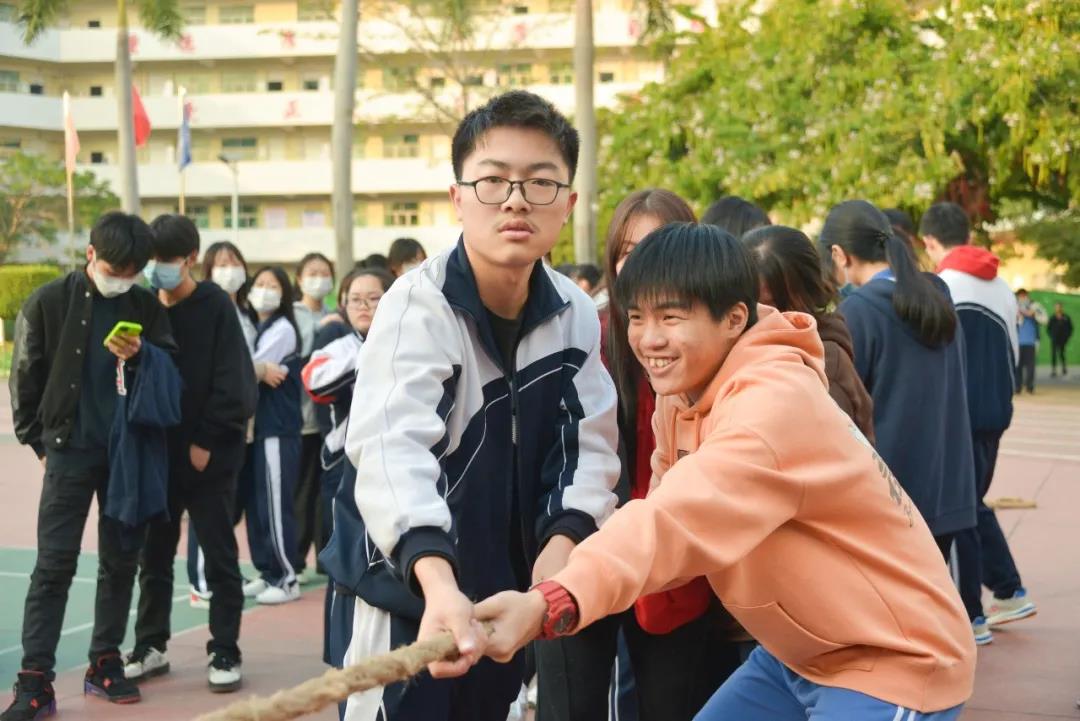 比赛现场,队员们一个个摩拳擦掌,排好了阵势。当比赛的哨声响起,队友们全都紧握绳子,憋足了劲把绳子往后拉。每个班未参加比赛的同学组成啦啦队在旁边为自己的班级加油呐喊着,更有甚者使出了"面具"战术,尝试"笑退"对手。班主任们也涨红了脸喊着"加油",恨不得抓起绳子跟队员们一起努力,整个场面既激烈又温馨,获胜的队伍欢呼雀跃,失败的队伍毫不气馁。