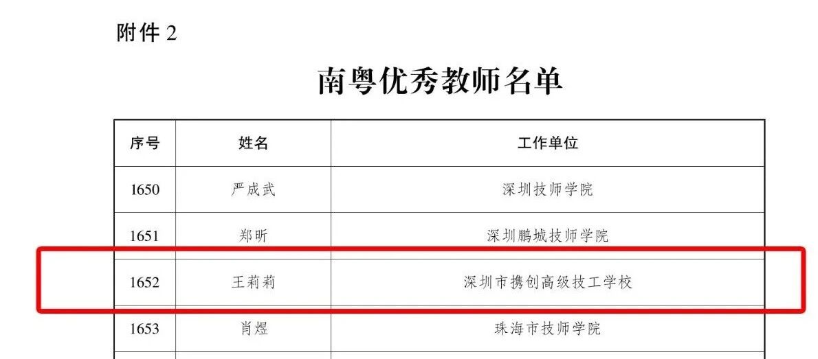 作为国家级重点技工学校,深圳市携创高级技工学校将以此为契机,持续营造尊师重教、崇尚技能的良好氛围,激励全体教师以王莉莉老师为榜样,立足三尺讲台,精研教学技艺,深耕产教沃土,培养更多心中有梦、眼里有光、手上有技的新时代高素质复合型技能人才!