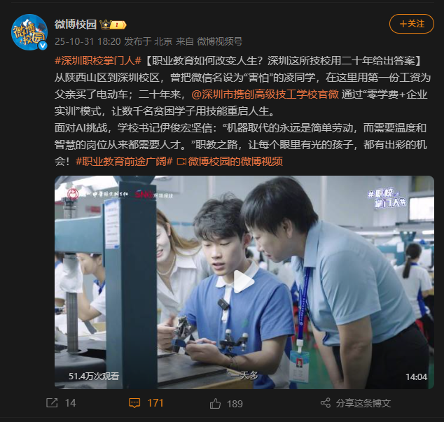 活动中,伊俊宏还深情讲述了“深桂雨露直通车”技能帮扶项目中一位学子的动人经历。来自广西巴马山区的罗同学,正是通过该项目走出大山,来到深圳市携创高级技工学校,接受免费的全日制职业技能教育。经过三年的刻苦学习和不懈努力,她顺利完成学业并在深圳成功就业,如今月收入已超过万元。从过去“连吃饭都成问题”的困境,到如今敢于“憧憬买房买车”,罗同学真正实现了“用技能重启人生”的蜕变。伊俊宏表示,“职业教育的意义不仅是传授技术,更是点燃希望。我们坚信,每个眼里有光的孩子,都值得被看见、被成就。”自2005年起,以深圳市工业行业培训中心为起点的深圳市携创高级技工学校积极响应国家东西部协作战略,持续致力于职业教育帮扶工作,重点面向贵州、甘肃、江西、广西、陕西等地区开展实践。学校相继实施了“深黔雨露直通车”“深桂雨露直通车”“深汕雨露直通车”等一系列技能帮扶项目。经过二十年的探索与发展,携创累计帮助来自8个省区(县市)、40余个经济欠发达地区的超过1.8万名像罗同学一样的困难家庭子女掌握技能并实现高质量就业。学校也因此成为全国唯一同时被国务院扶贫办授予“东西扶贫协作人力资源建设基地”和“全国贫困地区劳务技能培训深圳基地”两项国家级荣誉称号的技工院校。