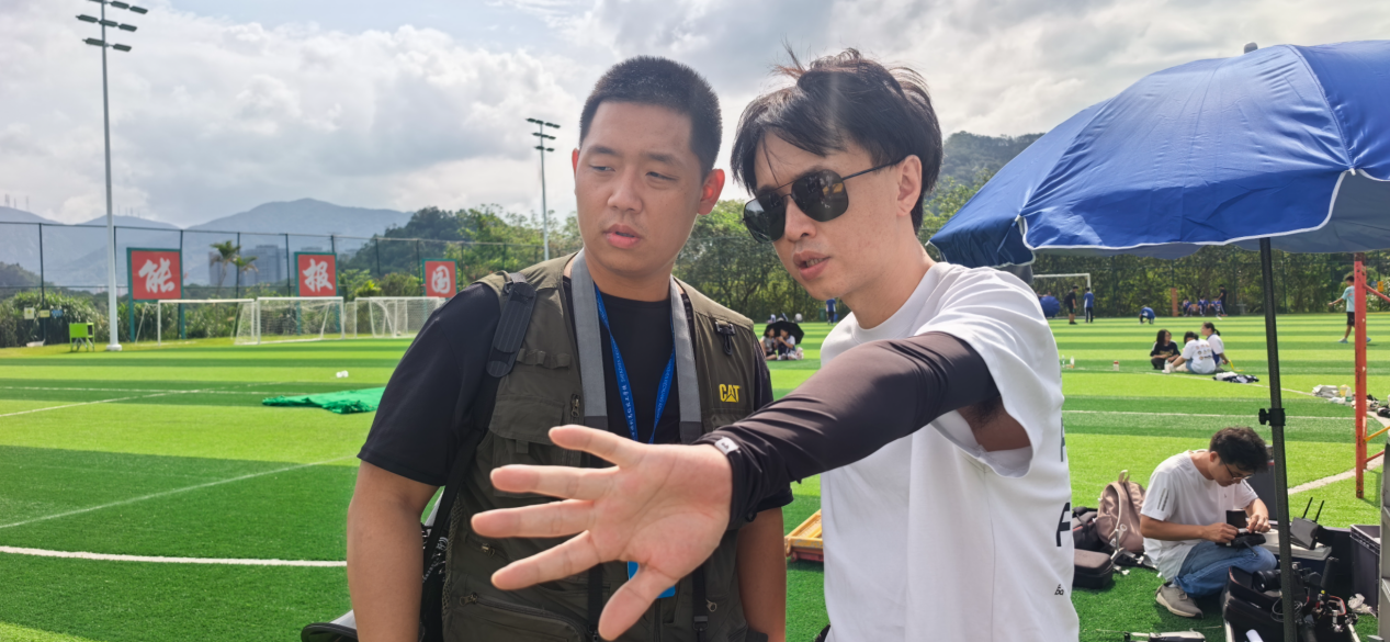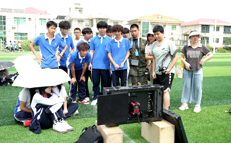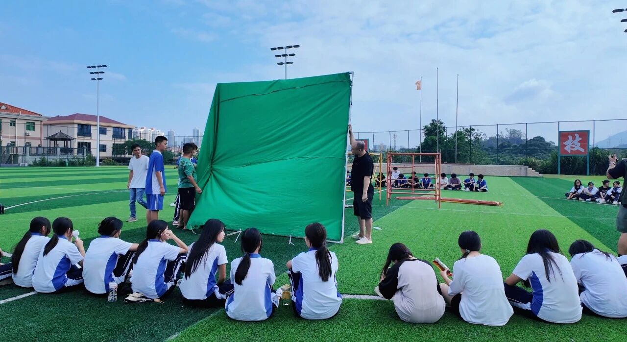 早晨,学校足球场化身实训场。9点不到,场地已热闹非凡,梅里爱公司团队携专业设备到场。从搭建灯光支架、调试摄像机位,到打磨背景布景细节,数媒学子全程积极参与,企业导师耐心讲解指导。因影片涉及高处跳台,搭好气垫后,万沥方导演亲自示范,学生们见状也跃跃欲试,现场氛围热烈。