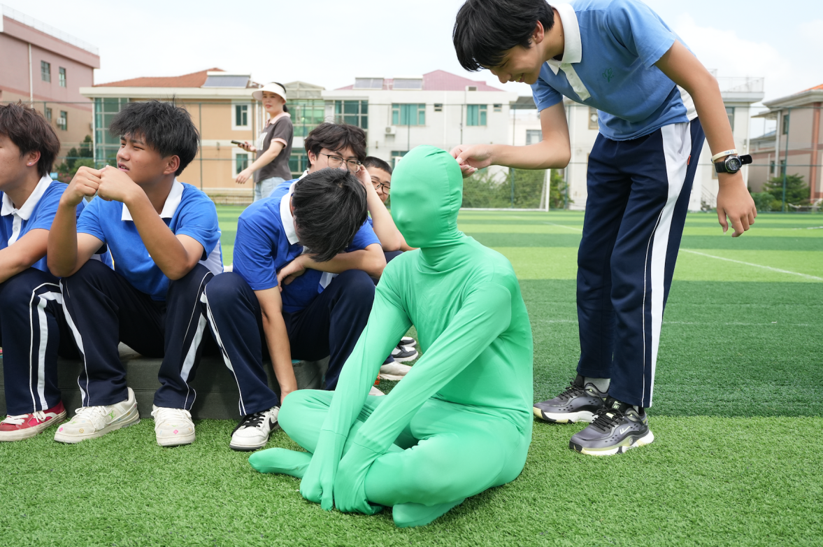 忽然一道绿光闪过,原来是邓赛同学正在体验剧组“小绿人”角色,新奇的体验让他满脸激动,眼里满是雀跃。