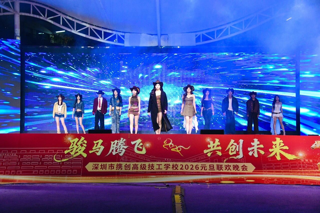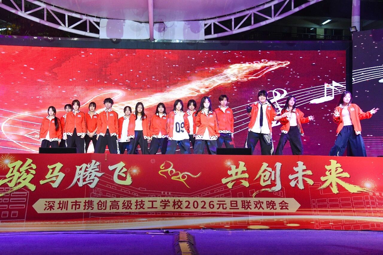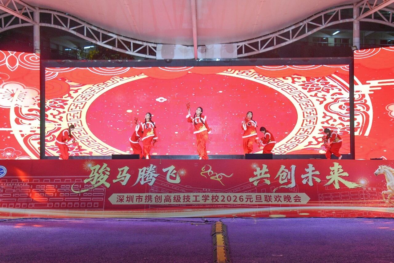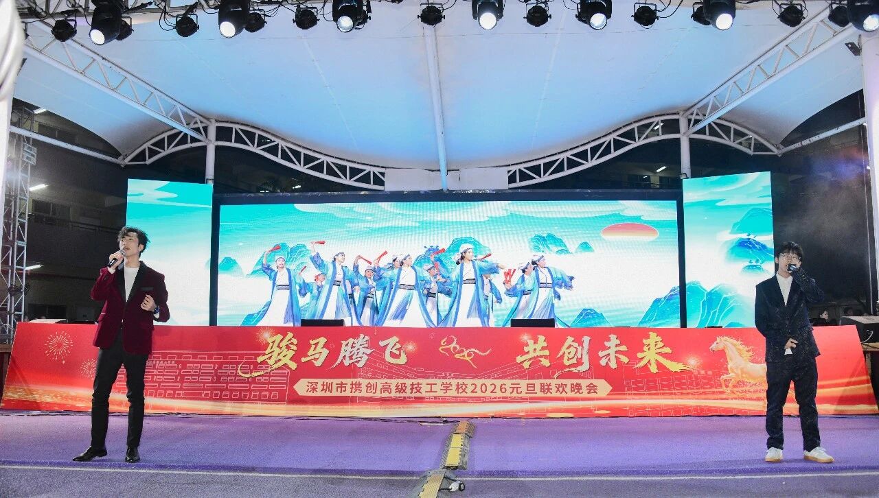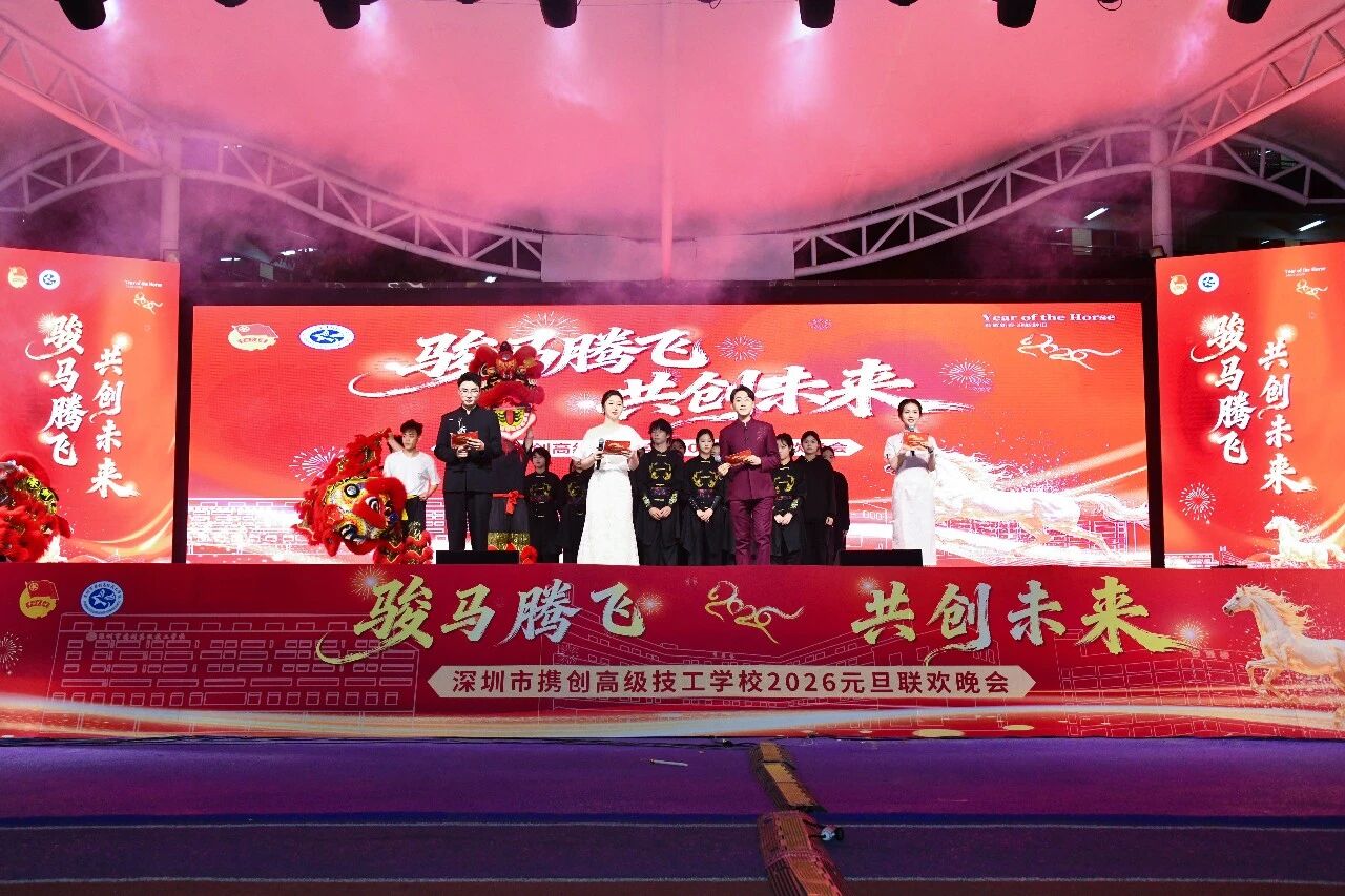 辞旧迎新,华章再启。12月30日晚,深圳市携创高级技工学校“骏马腾飞·共创未来”2026年元旦晚会隆重举行。全校师生与特邀嘉宾欢聚一堂,共同迎接新年的到来。本次晚会由校团委倾力主办,筹备超一个月,最终为观众奉献了一场精彩纷呈的视听盛宴。晚会还通过学校官方视频号及校外媒体“精彩横岗”同步直播,累计吸引在校师生、校友、家长及社会公众超二十万人次在线观看,反响热烈。