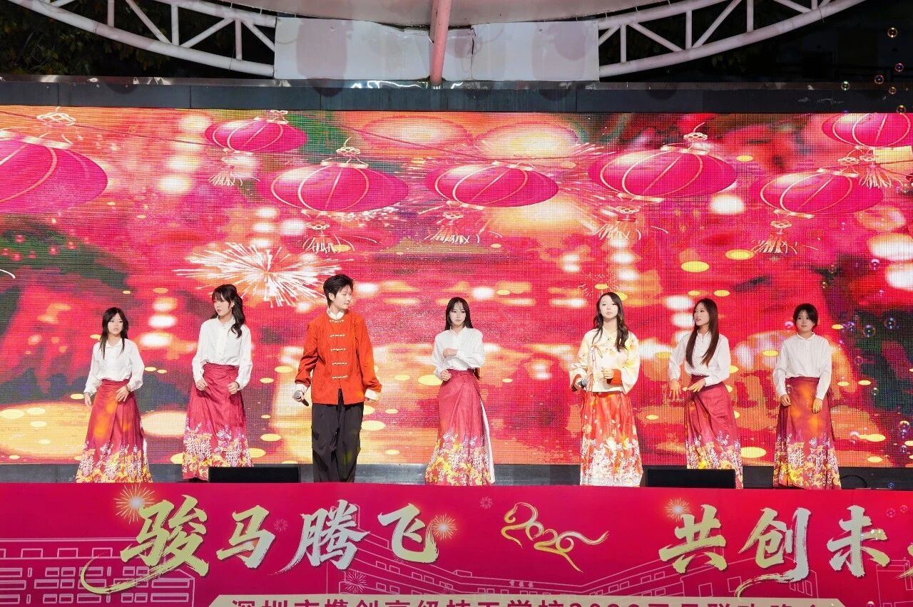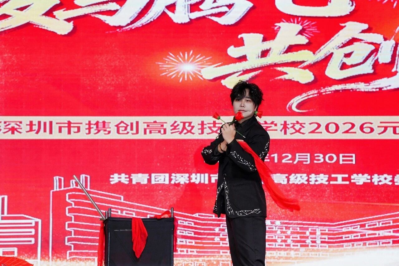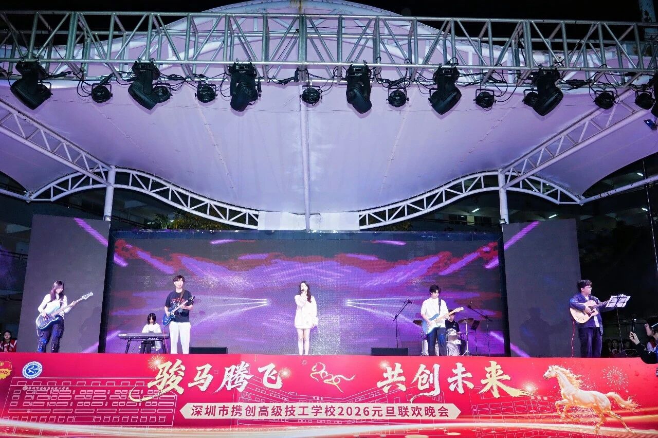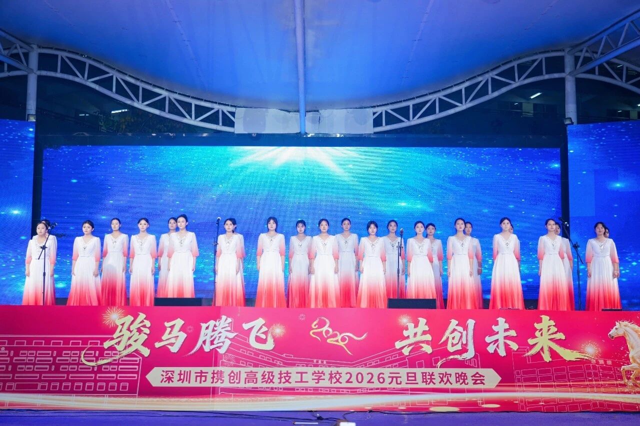 辞旧迎新,华章再启。12月30日晚,深圳市携创高级技工学校“骏马腾飞·共创未来”2026年元旦晚会隆重举行。全校师生与特邀嘉宾欢聚一堂,共同迎接新年的到来。本次晚会由校团委倾力主办,筹备超一个月,最终为观众奉献了一场精彩纷呈的视听盛宴。晚会还通过学校官方视频号及校外媒体“精彩横岗”同步直播,累计吸引在校师生、校友、家长及社会公众超二十万人次在线观看,反响热烈。