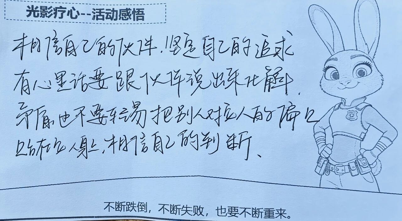 第二场“光影疗心”活动中,同学们共同观看《疯狂动物城2》,在朱迪与尼克的故事中感悟成长的真谛。影片中“别让偏见成为你与世界之间的墙”等台词引发深深共鸣。李翠老师结合心理学知识,引导同学们打破标签束缚,建立稳定的自我认知,并学会在差异中欣赏他人、共同成长。一场电影,一次思考,同学们在光影交错中找到了前行的勇气。