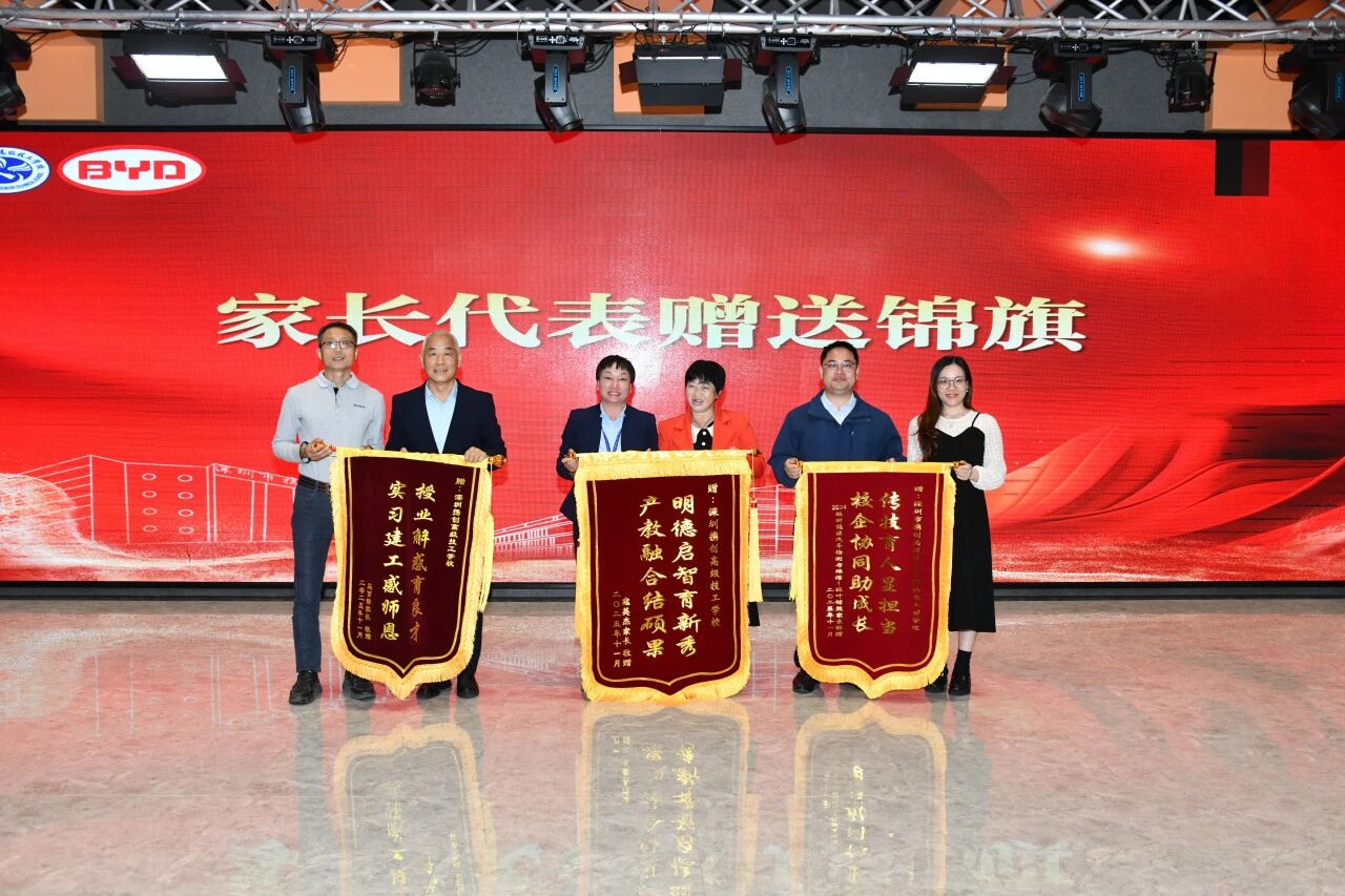 学生代表2024级新能源汽车检测与维修专业叶铭然分享实习感悟时称,在比亚迪车间实践的经历让他深刻体会到“工匠精神蕴含于每一处细节的严谨”。家长代表陈明先生则表示,孩子通过工学交替“不仅提升了技能,更学会了责任与担当”,对学校搭建的产教融合平台深感欣慰。随后家长代表与比亚迪公司向学校赠予锦旗,彰显了三方互信互助、合作共赢的坚实基础。